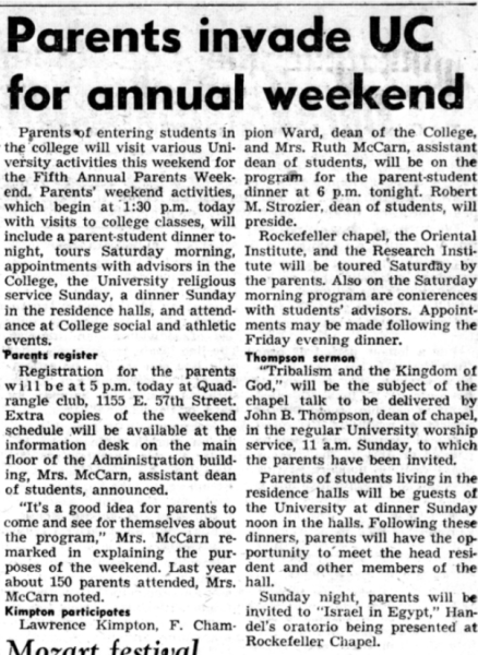 Today marks the start of UChicago’s annual “Family Weekend.” More than 70 years ago, families also had the opportunity to tour the campus, attend talks, and visit classes.