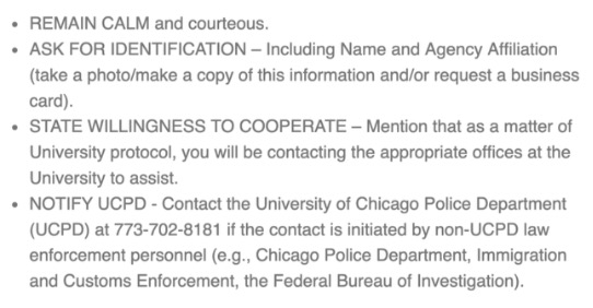 The original statement did not include the number for the OIA, and specified to only contact the UCPD if the contact is initiated by non-UCPD law enforcement personnel. The update also specifies to only ask for identification “[w]hen practical.”
